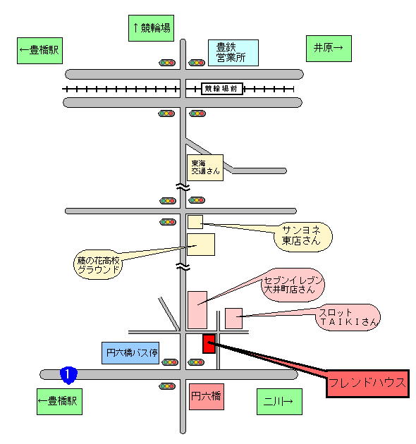 競輪場前電停下車。信号に向かって左側へ道路を渡りまっすぐ歩くと左手に東海交通(タクシー)の営業所。さらにまっすぐ進むとサンヨネ東店の交差点。さらに直進すると左手にセブンイレブン大井町店。その隣です。徒歩15分くらい。